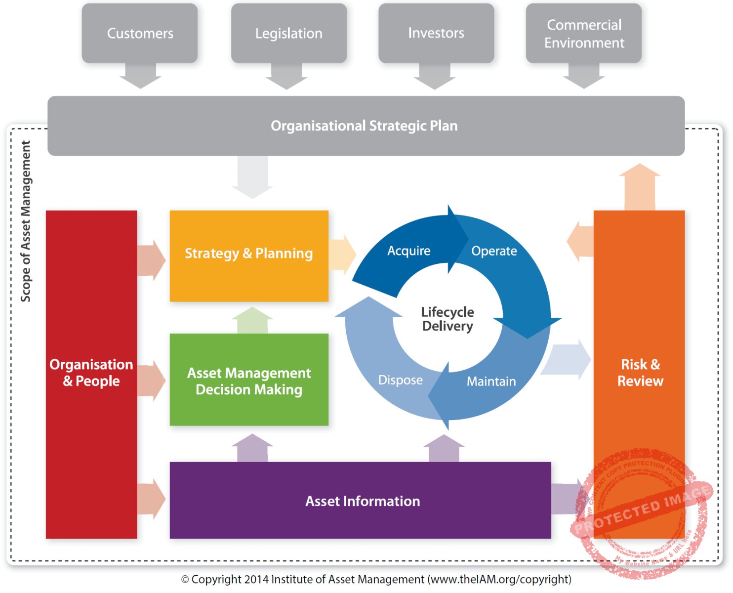 Various institutes defining and formulating views and visually displaying the Asset Management landscape and content. Most well known are the Institute Of Asset Management (IAM) and the Global Forum On Maintenance & Asset Management ( GFMAM ) which works closely with the European Federation of National Maintenance Societies ( EFMNS ) who, for example, defines the competence of the ‘Maintenance Manager’. The Institute of Asset Management (IAM), for example, defines the Asset Management landscape in a conceptual model for the purpose of describing the whole of Asset Management framework. The landscape is divided into six topics that run through 39 processes. The first edition of this landscape was published in Asset Management – An Anatomy November 2011, the second edition was published in March 2014 and the third edition was published in December 2015 (Institute of Asset Management, 2015).