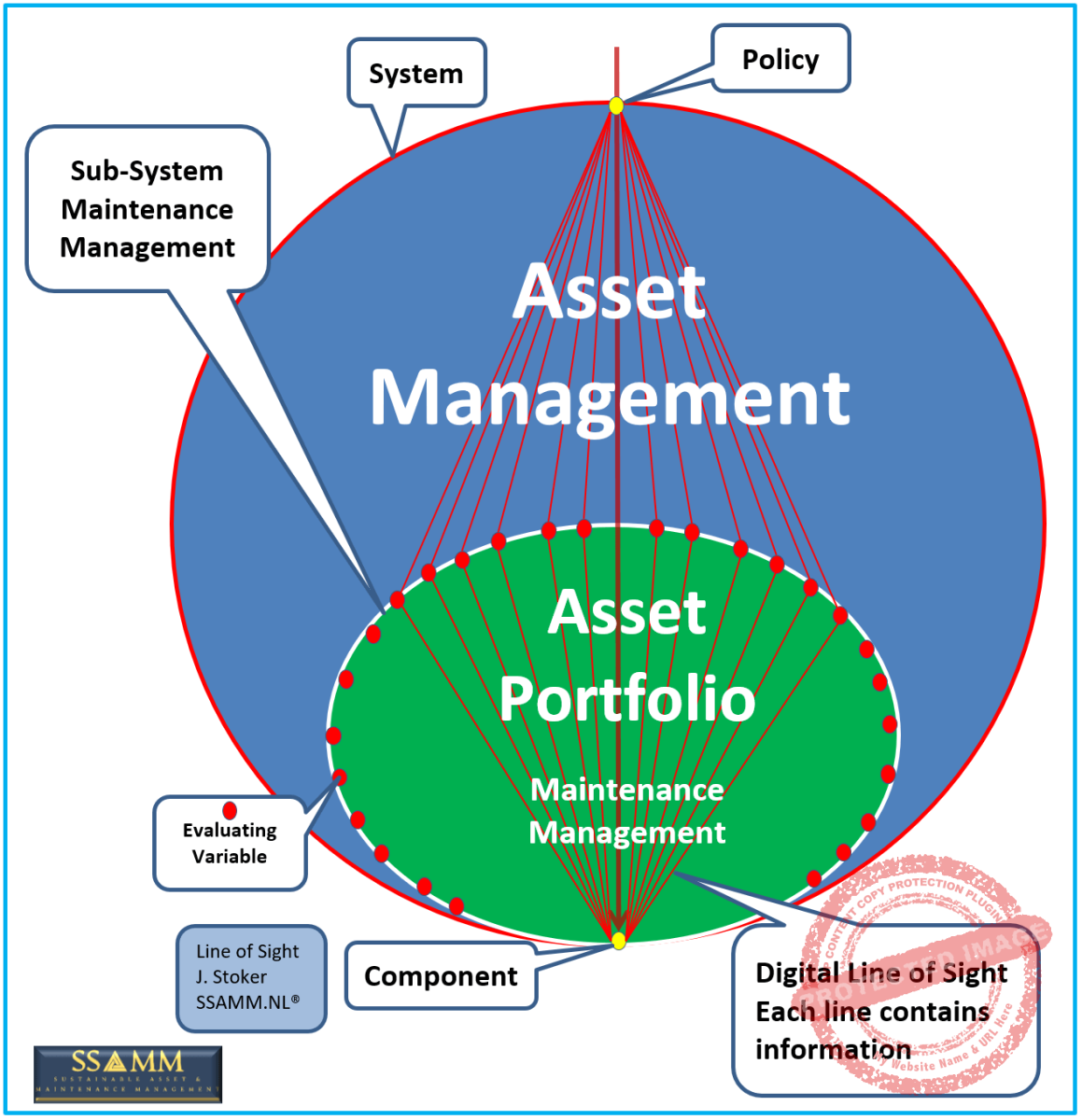 The research is focused on the role of Maintenance Management as one of the four fundamental basic principals of Asset Management as defined in the NEN-ISO 55000. The reason is that the ISO 55000 Maintenance Management regarded as one of the four fundamental pillars of Asset Management. Despite the fact that the standard defines a Asset in such a way that it could be anything, it gives no insight into the structures in which Assets are composed. The research aims to provide insight into this through from the inheritance the three types of element structures (Civil, Building and Industrial Process) adding to the paradigm used by the standard and connecting the policy to the smallest Asset component. This linkage is named “The Line Of Sight” and is based on the analogy with the ” Research Onion “. The following considering describes (shortened) this insight so that the degree of influence of failure by the smallest Asset Component definable and/or quantified and is part of a number of related topics. Derived of this consideration is the SAMP/AMP, the definition of the concept Maincontracting and other related topics and objectives of the research.